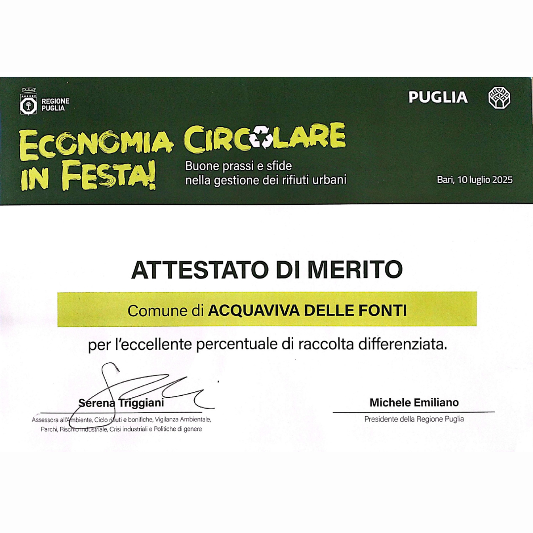 Il Comune di Acquaviva delle Fonti ha registrato un risultato eccellente nella raccolta differenziata, posizionandosi tra i Comuni più virtuosi del territorio pugliese. Un dato che conferma il percorso di crescita e responsabilità ambientale intrapreso dalla comunità cittadina.
