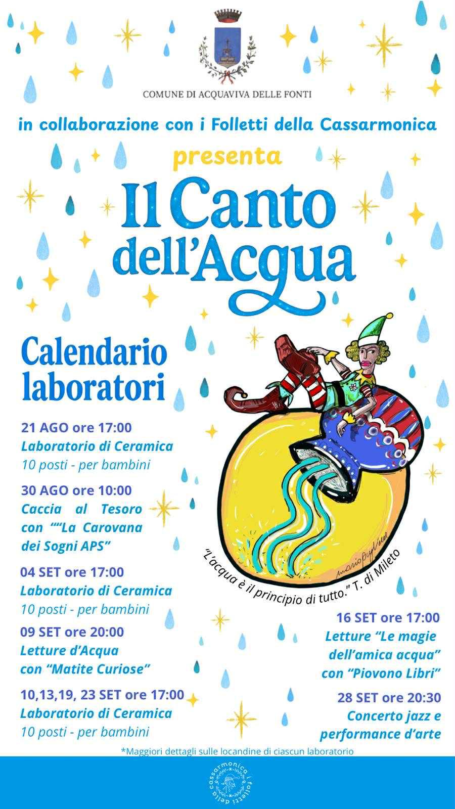 Il Comune di Acquaviva delle Fonti presenta “Il Canto dell’Acqua”, un ricco calendario di laboratori e attività, organizzato da I Folletti della Cassarmonica, che accompagneranno bambini, famiglie e cittadini in un viaggio tra creatività, gioco e cultura, con un tema ispirato all’elemento più vitale: l’acqua.