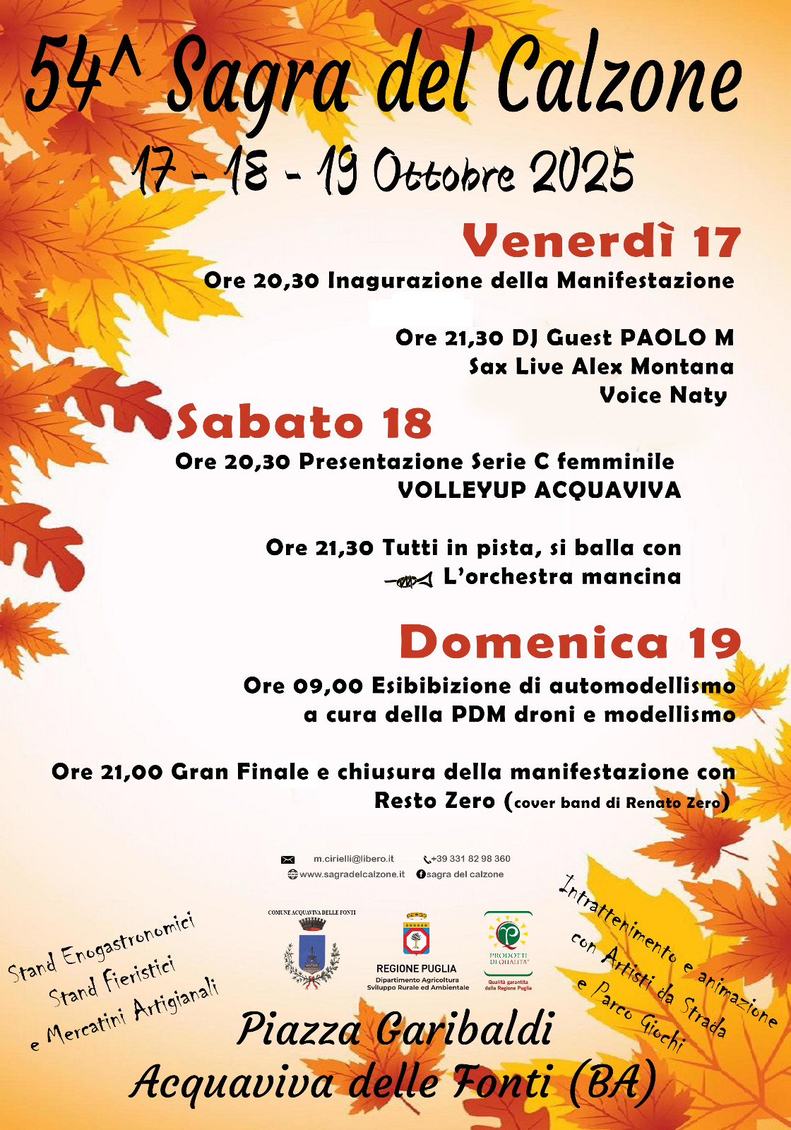 Tre giorni di profumi, tradizioni, musica e convivialità. Dal 17 al 19 ottobre 2025, Piazza Garibaldi e le vie del centro storico di Acquaviva delle Fonti ospiteranno la 54ª edizione della Sagra del Calzone di Cipolla, l’appuntamento più atteso dell’autunno acquavivese, organizzato dal comitato organizzatore guidato dalla famiglia Cirielli e promosso dal Comune di Acquaviva delle Fonti in collaborazione con la Regione Puglia e la rete dei Prodotti di Qualità Pugliese.