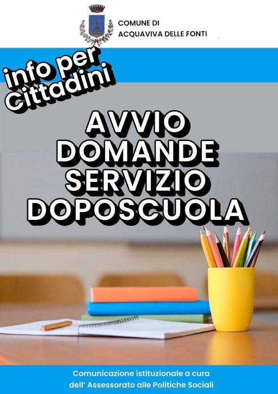 A cura di Settore Affari Generali e Servizi al cittadino - Ufficio Servizi Sociali Atrio Palazzo di Cittą, 1 - Acquaviva delle Fonti 70021 PEC: affarigenerali.comuneacquaviva@pec.itEmail: affarigenerali@comune.acquaviva.ba.itTelefono: +39 080 3065207